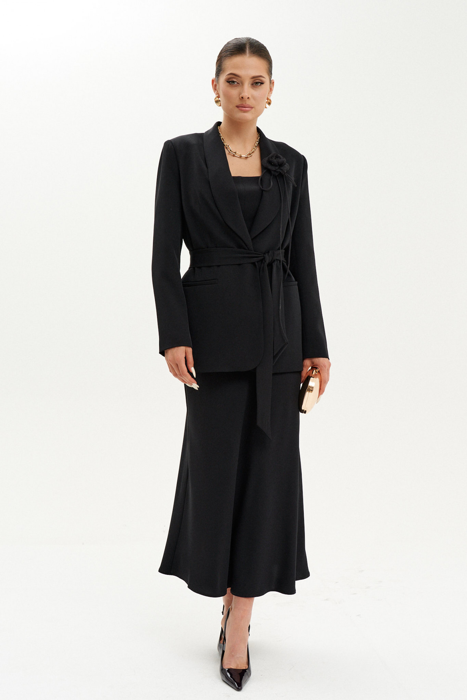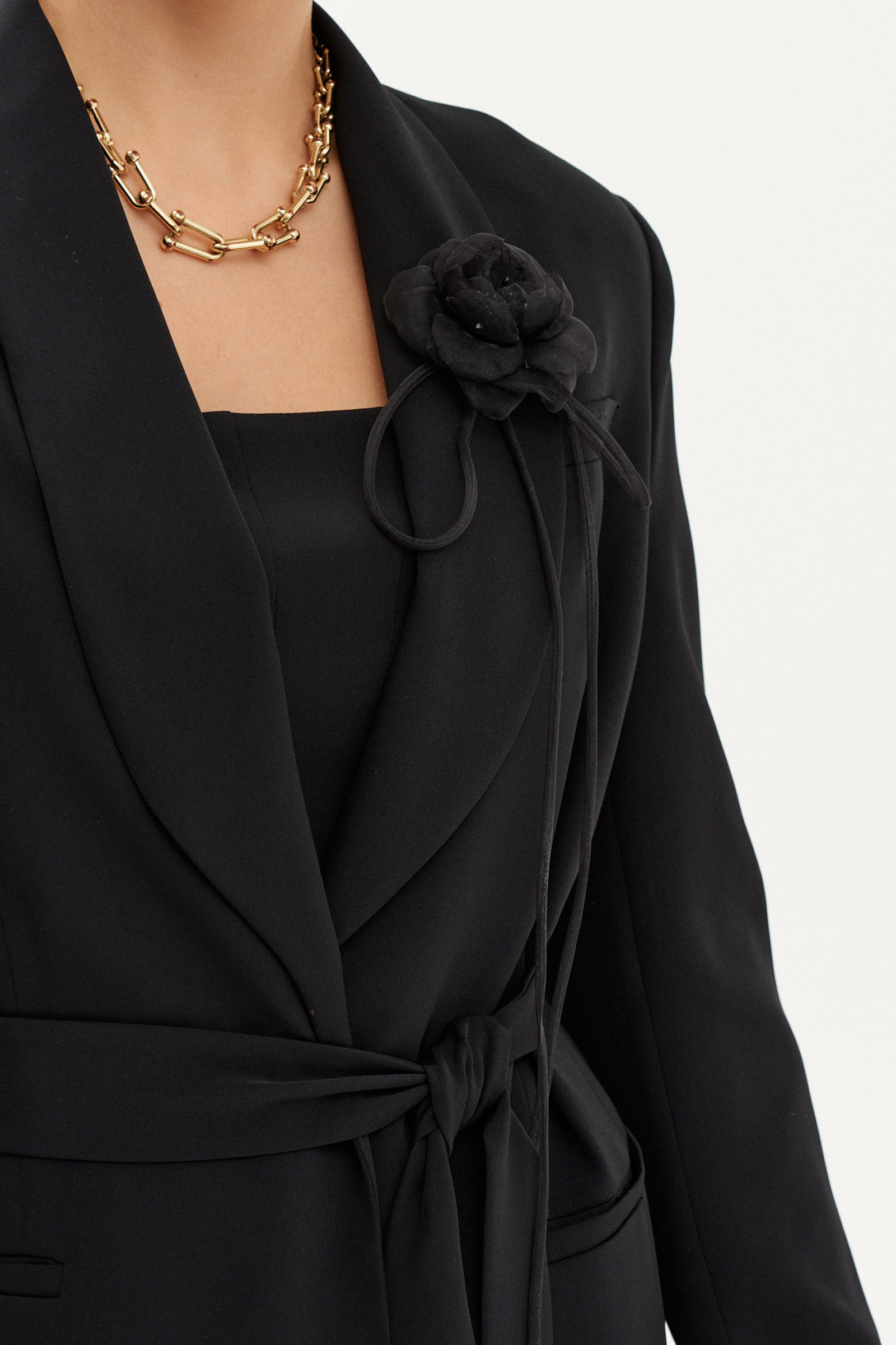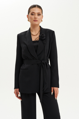 Жакет женский из лёгкой костюмной ткани прямого силуэта для повседневной и торжественной носки. Перед имеет нагрудный карман с листочкой, а также два прорезных кармана с листочкой. По переду располагаются два рельефа, идущих от линии проймы до линии низа, а также две талиевые вытачки. Спинка со средним швом. Горловина обработана воротником шаль. Рукава втачные длинные, двухшовные. Жакет на поливискозной подкладке. Для придания формы в области талии имеется пояс, а также потайная пуговица для фиксации. Пояс из основной ткани. В качестве дополнительного элемента имеется украшение в виде цветка (чокер) на завязке. Данный аксессуар регулируется длиной шнуровок лобо крепится на булавку. Позволяет варьировать использование вашего чокера с новым образами, а также можно использовать наш чокер в виде замечательной брошки. Красивый и утонченный жакет в котором любая девушка будет чувствовать себя в центре внимания.