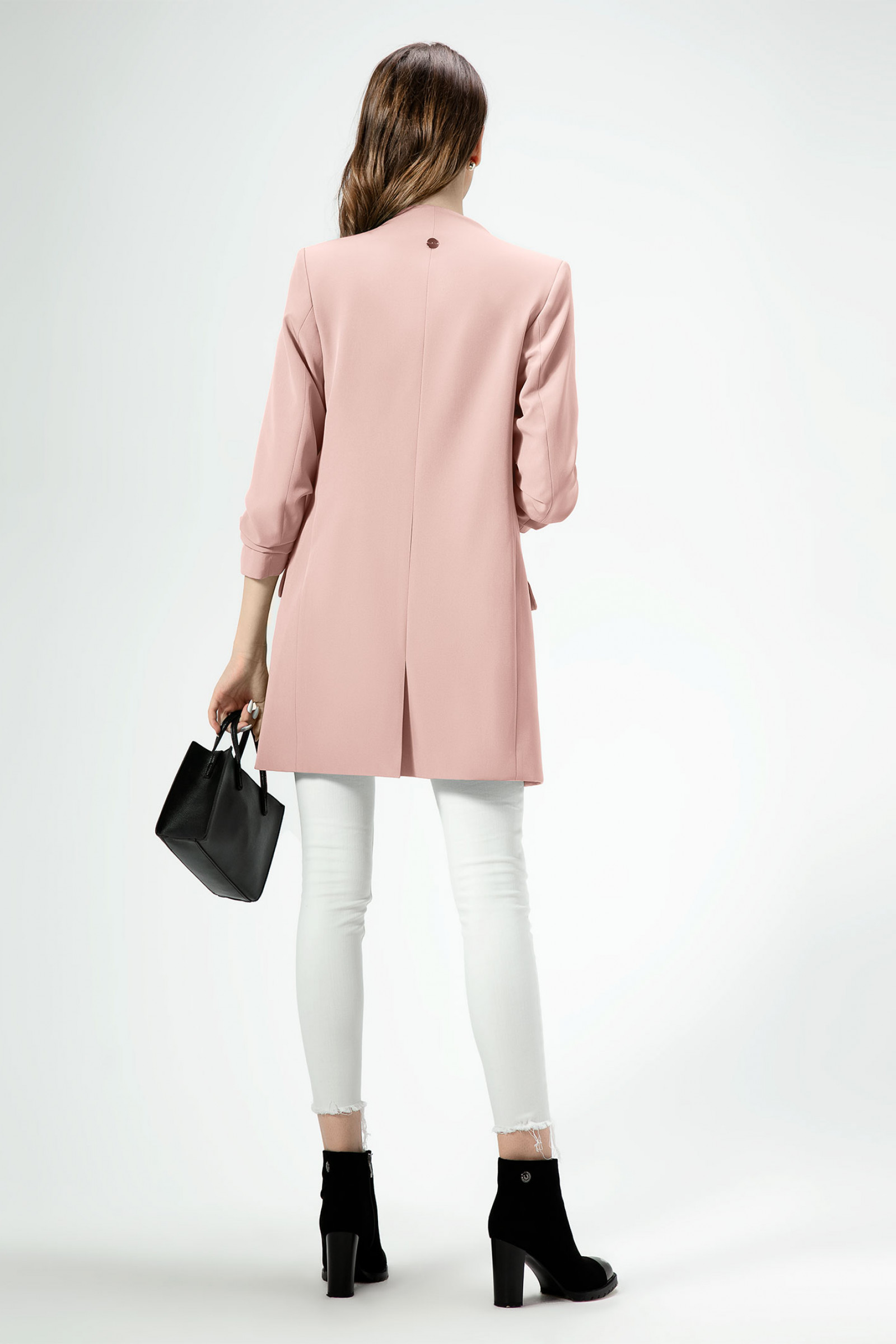 Стильный модный жакет в стиле "кэжуал". Это повседневный удобный и практичный жакет, который отлично сочетается как с джинсами, так и с брюками. Жакет удлиненный, без застежки, рукава длиной ниже локтя. По переду имеются карманы. Спинка со средним швом, который заканчивается шлицей. Жакет на подкладки.