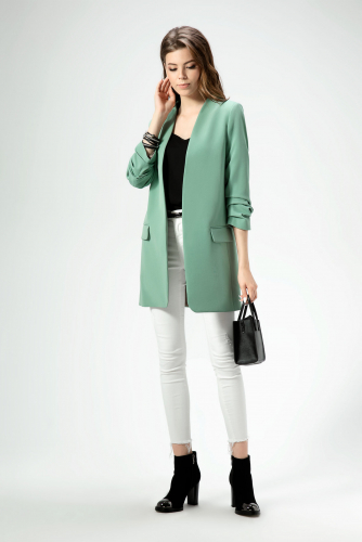 Стильный модный жакет в стиле "кэжуал". Это повседневный удобный и практичный жакет, который отлично сочетается как с джинсами, так и с брюками. Жакет удлиненный, без застежки, рукава длиной ниже локтя. По переду имеются карманы. Спинка со средним швом, который заканчивается шлицей. Жакет на подкладки.