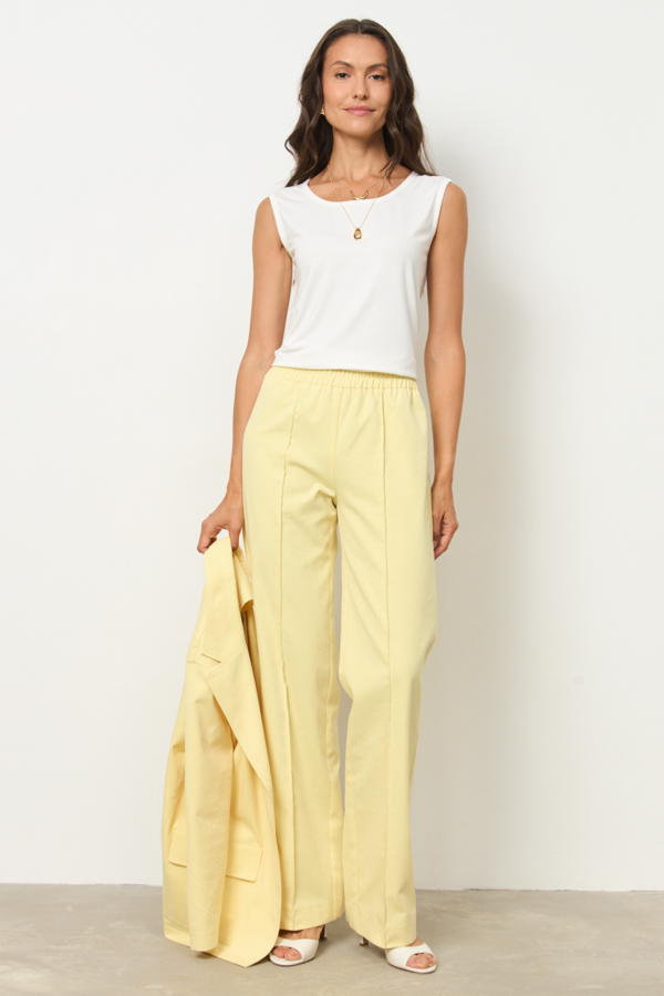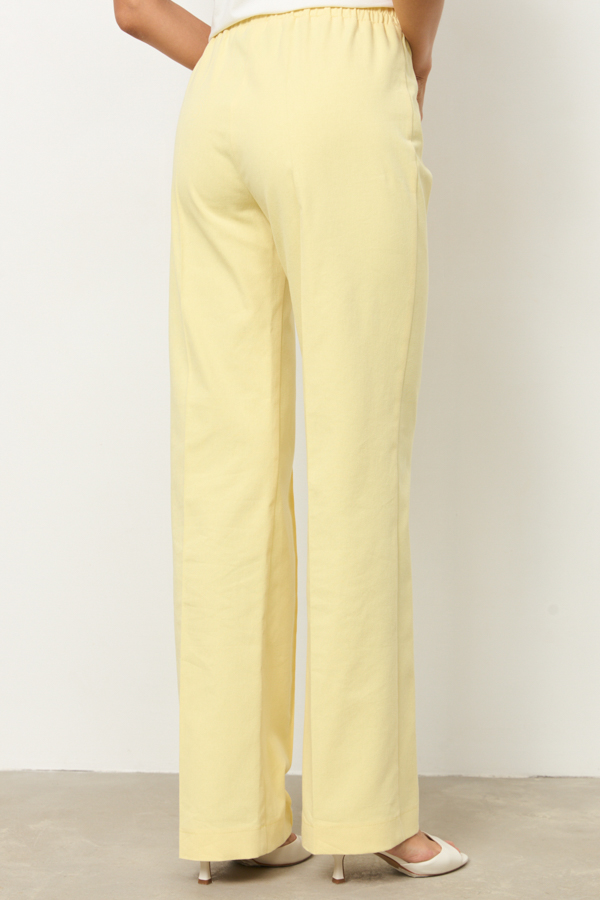 Брюки из хлопковой ткани прямого силуэта. Пояс притачной с эластичной резиной. На передней части брюк застрочены стрелки.