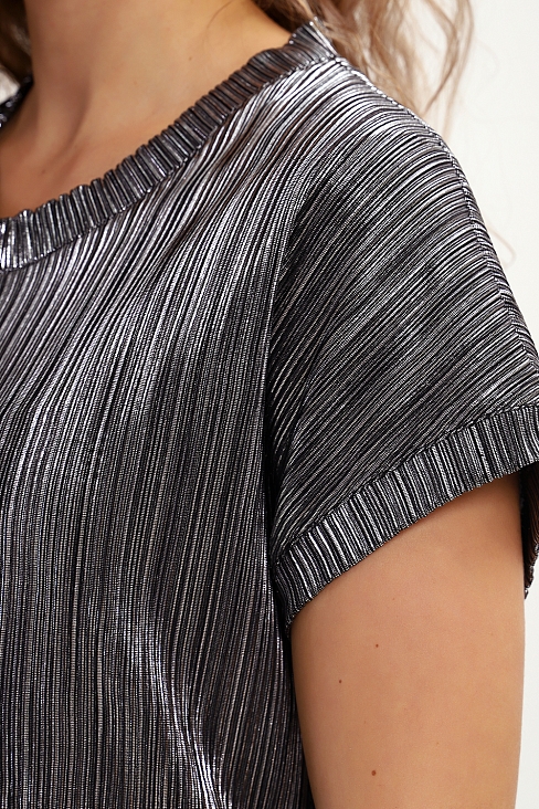 Стильная нарядная блузка, сочетающая в себе комфорт и элегантность. Благодаря свободному крою, блузка создает легкий силуэт и деликатно скрывает особенности фигуры. Добавляет изюминку изделию блестящая ткань с прочным напылением фойл, которое отлично держится на ткани после стирки. Ткань атлас гофре приятна на ощупь, хорошо тянется, не мнется, держит форму. Блузка смотрится и как офисная, и как вечерняя модель, а также это отличный вариант для летнего наряда. Округлая горловина, обработанная обтачкой, подчеркивает женственность образа, спущенный рукав не стесняет движений.  Нарядная блузка позволит вам эффектно выглядеть не только на праздничных мероприятиях, но и в будни.