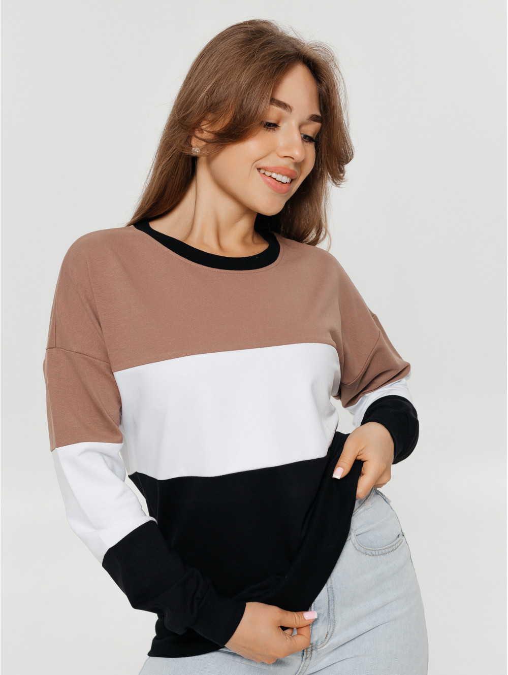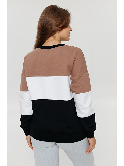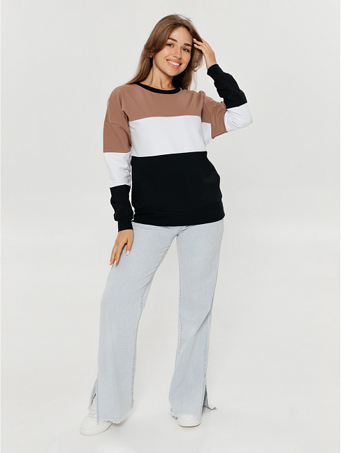 Удобный крой, не сковывающий движений, отсутствие пуговиц, молний, шнуровок. Горловина кофты круглая, рукава и низ изделия на манжете из рибаны.