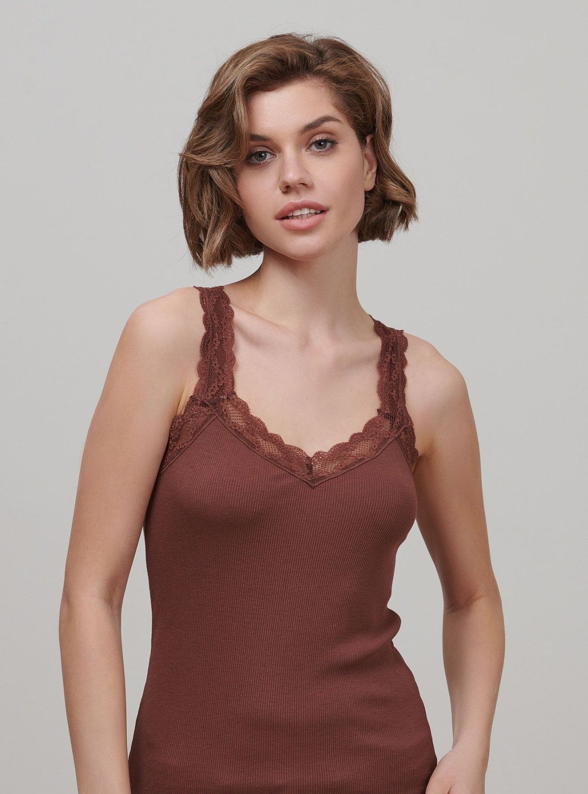 Женская майка-топ от торговой марки Индефини.  Майка из вискозы, коричневого цвета, с V-образным вырезом горловины, с кружевными вставками и обрамлением, на лямках, прямая, с рюшами по краю.