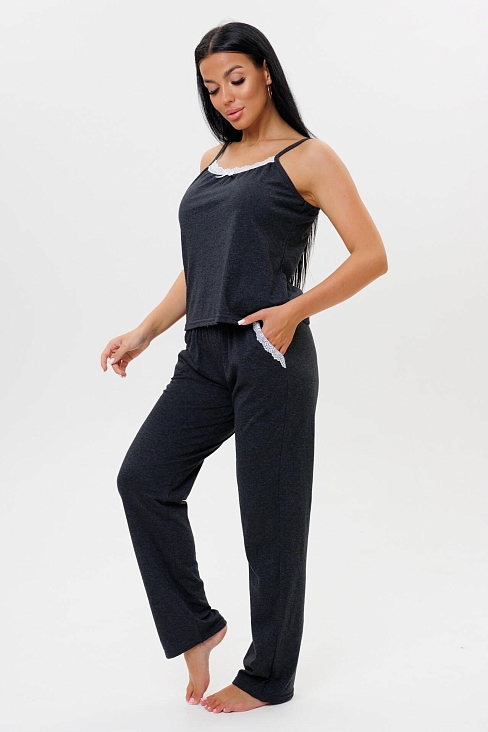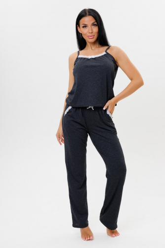 Пижама 2062 / Антрацит сшита из трикотажного полотна кулирки с содержанием 50% хлопка. Пижама состоит из топа и брюк. Топ на тонких лямках отделан по линии выреза кружевом с бантом. Брюки прямого кроя на широкой резинке с бантом, дополнены по бокам карманами, которые декорированы кружевом.