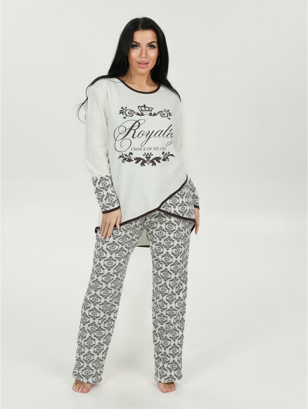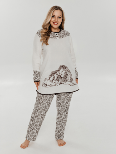 Представляем Вам нашу пижаму АЛИНА, изготовленную из двух видов тканей, прекрасно сочетающихся между собой. Комплект изготовлен из хлопковой ткани футер с начесом, состоит из кофты с длинным рукавом и брюк. Горловина, низ кофты и рукавов обработаны окантовкой. Вставка на полочке и манжеты выполнены из набивной ткани. На полочке оригинальный принт. Модель согреет Вас теплом, позволит сбросить накопленное напряжение за целый день и хорошо уснуть.