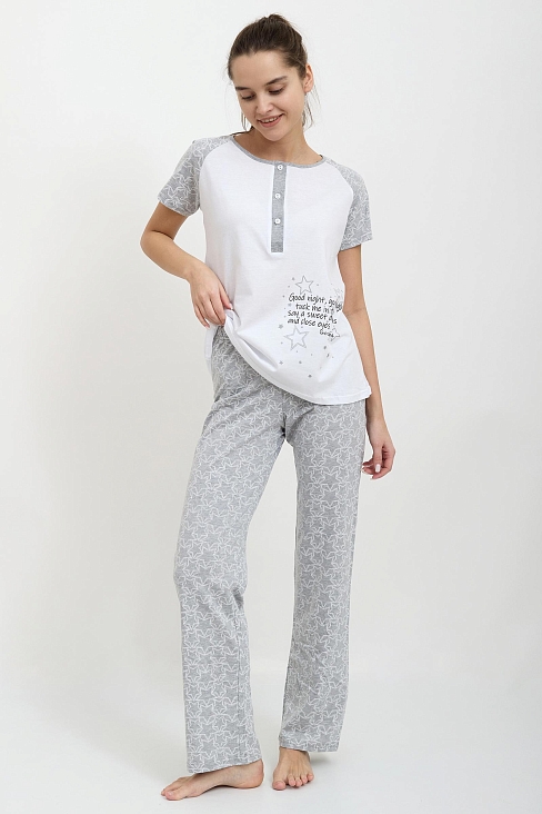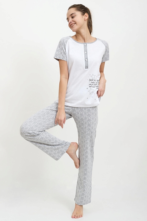 Женская пижама из качественной кулирки. В комплекте футболка прямого кроя и длинные брюки. Футболка комбинирована: полочка из белой ткани с принтом, а спинка из ткани с рисунком. Рукав реглан короткий. Круглый вырез горловины с функциональными пуговицами по планке. Брюки прямого кроя из ткани с рисунком, оборудованные двумя карманами. Такой комплект подарит вам комфортный сон.