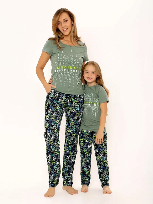 Женская пижама "Inspiration" / Хаки арт. к1251хк для дома и отдыха из хлопкового полотна высокого качества, лёгкая, удобная и в то же время невероятно красивая. Пижама - полуприлегающего силуэта, состоит из футболки с коротким рукавом и свободных, не стесняющих движений брюк с высокой посадкой и боковыми карманами. Женская пижама выполнена в направлении Family Look (Фэмили лук), поэтому Вы всегда сможете подобрать похожий образ для любимой дочки. Полочку домашнего костюма украшает авторский яркий стилизованный принт.