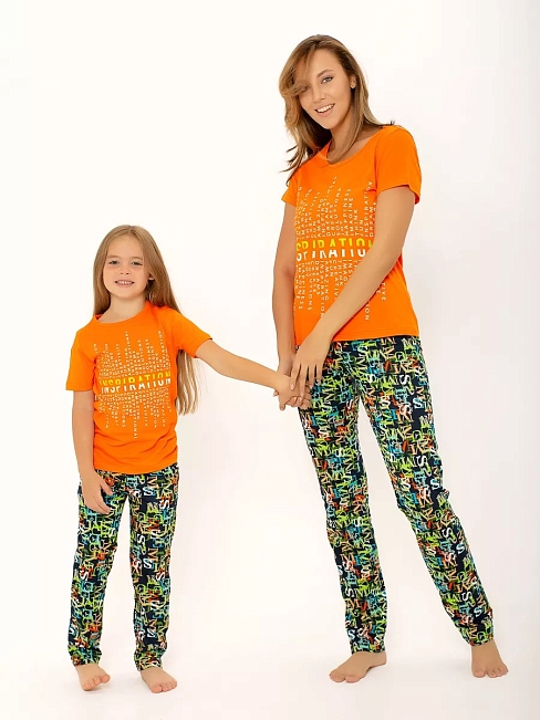 Женская пижама "Inspiration" / Оранжевый арт. к1251ор для дома и отдыха из хлопкового полотна высокого качества, лёгкая, удобная и в то же время невероятно красивая. Пижама - полуприлегающего силуэта, состоит из футболки с коротким рукавом и свободных, не стесняющих движений брюк с высокой посадкой и боковыми карманами. Женская пижама выполнена в направлении Family Look (Фэмили лук), поэтому Вы всегда сможете подобрать похожий образ для любимой дочки. Полочку домашнего костюма украшает авторский яркий стилизованный принт.