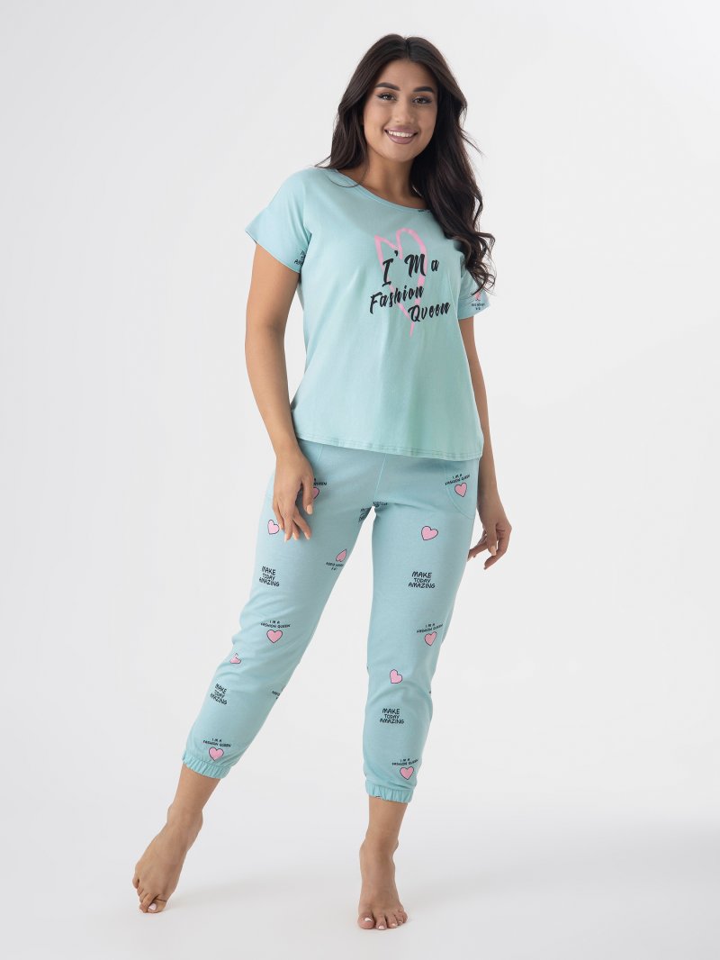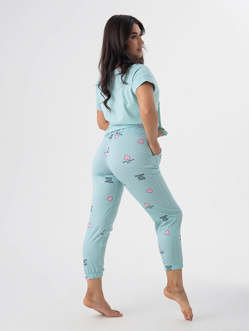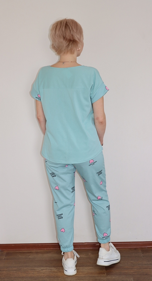 из кулирки, 100% хлопок. Женский летний костюм с брюками состоит из футболки с принтом на груди и прямых пижамных брюк.