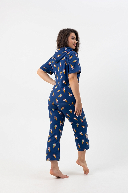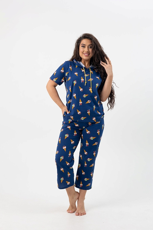из кулирки, 100% хлопок. Женский домашний костюм состоит из футболки с короткими