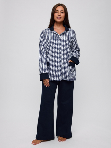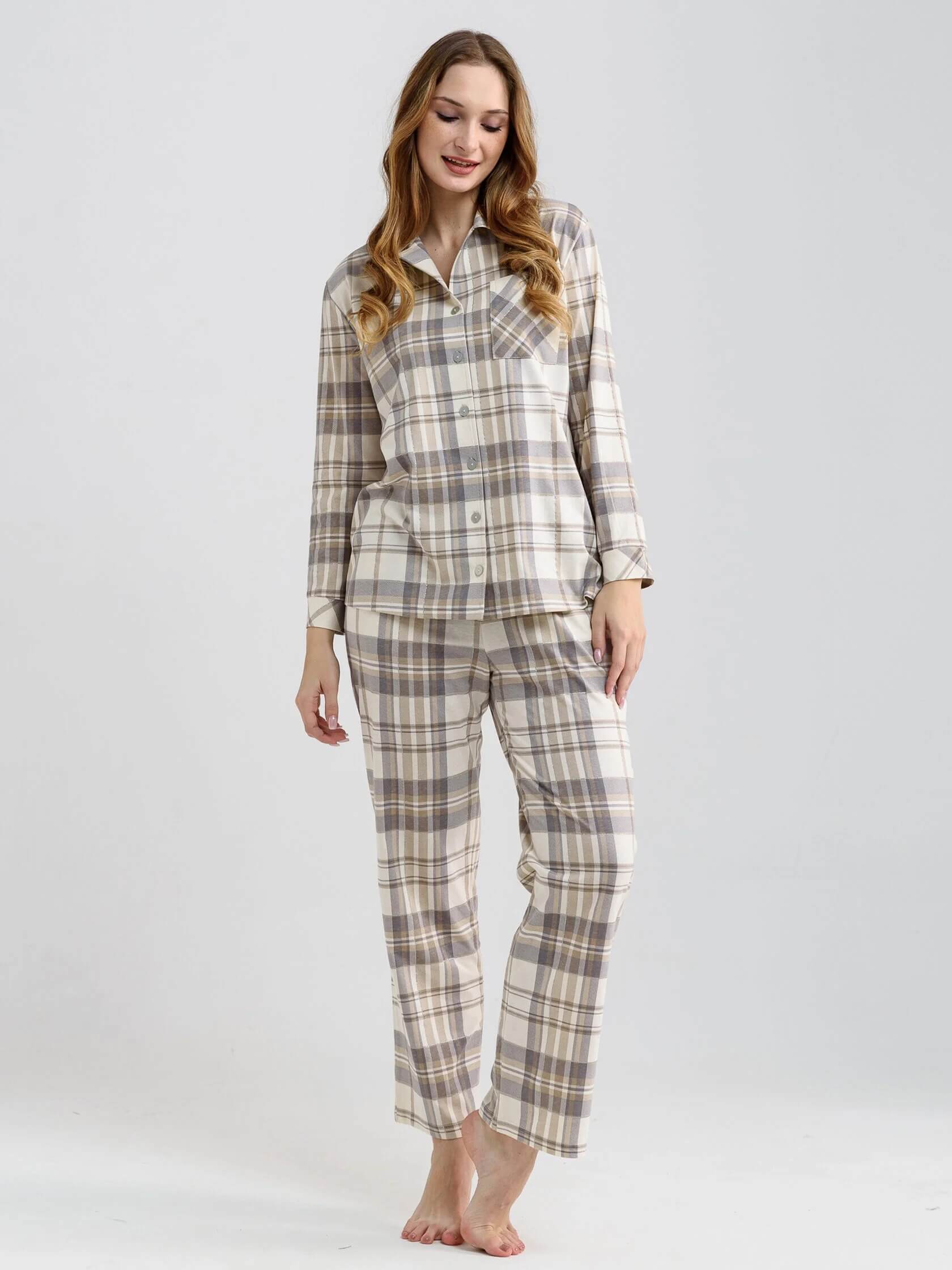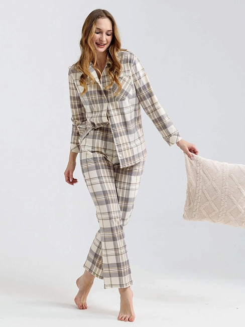 Женская пижама "Комфорт" (классическая) 2005-К / Бежевый с брюками и рубашкой украшена элегантной клеткой и пуговицами, добавляющими изысканность образу. Удобные карманы на верхней полочке рубашки и тип ростовки для высоких позволяют адаптировать пижаму под любой рост, делая её универсальной. Без утепления, она идеально подходит для домашнего использования в теплые дни.