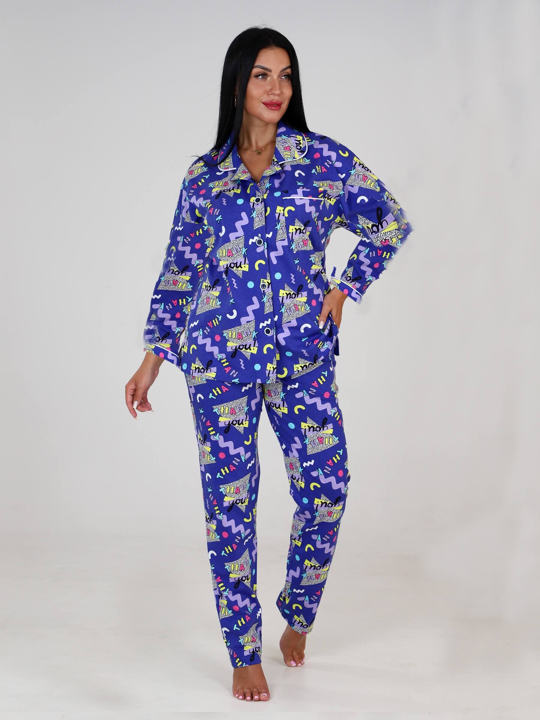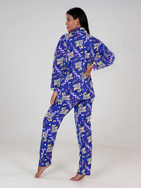 Костюм женский трикотажный из кулирки ЛЕДИ длинный рукав КК-448 / Мишура сиреневый - незаменимая вещь в базовом гардеробе. Домашний костюм состоит из рубашки с накладным карманом на полочке и брюк чуть зауженного силуэта. Стильный домашний женский костюм из 100% хлопка подойдет на каждый день. Домашний костюм хорошо пропускает воздух и не будет стеснять ваши движения благодаря мягкой трикотажной ткани. Яркий, сочный принт не оставит никого равнодушным, подойдет под любое Ваше настроение. Трикотажный домашний комплект подойдет для дома, для отдыха, для сна, для дачи, в поездку, на море, на отдых, а так же не стеснит движения даже во время активной игры с ребенком или уборки, а рубашка свободного кроя скроет недостатки фигуры.