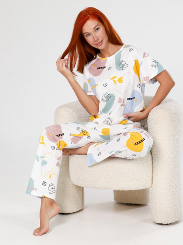 Костюм женский трикотажный из кулирки - незаменимая вещь в базовом гардеробе. Домашний костюм с короткими рукавами состоит из рубашки с накладным карманом на полочке и брюк чуть зауженного силуэта. Стильный домашний женский костюм из 100% хлопка подойдет на каждый день. Домашний костюм хорошо пропускает воздух и не будет стеснять ваши движения благодаря мягкой трикотажной ткани. Яркий, сочный принт не оставит никого равнодушным, подойдет под любое Ваше настроение.