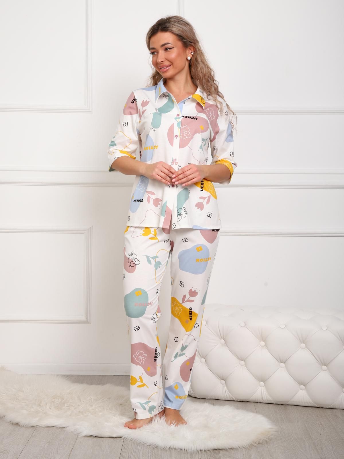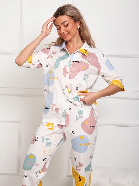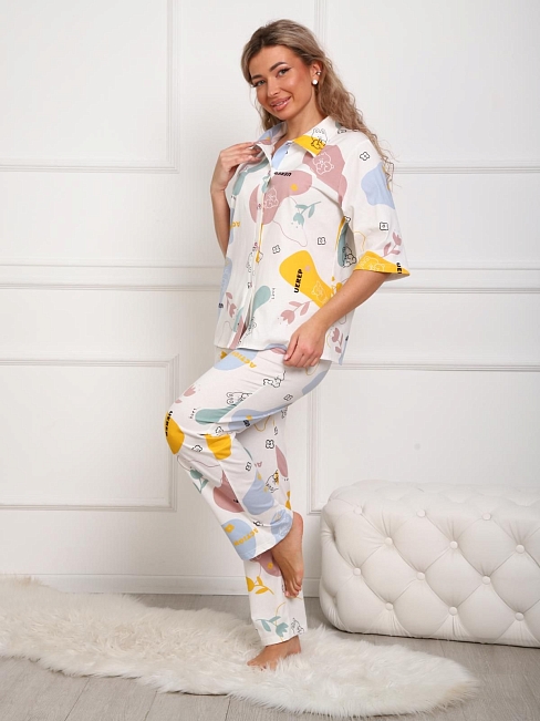 Пижама "Лиадан" из набивного трикотажного полотна "кулирка" состоит из рубашки и брюк. Рубашка свободного покроя с короткими втачными рукавами, отложным воротником, нагрудным карманом и центральной бортовой застежкой на петли и пуговицы. Спинка и полочка с отрезной кокеткой. Брюки длинные, свободного покроя, на притачном поясе с эластичной лентой и карманами в боковых швах.