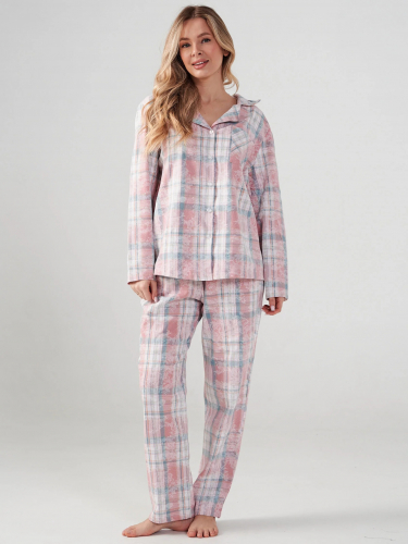 Пижама женская из трикотажного полотна «кашкорсе» с набивным рисунком, состоящая из футболки и брюк. Футболка - классического покроя с углубленной формой горловины, обработанной эластичной тесьмой с фасонным краем и цельнокроеными рукавами. Брюки – длинные, свободные, с эластичной тесьмой по талии.