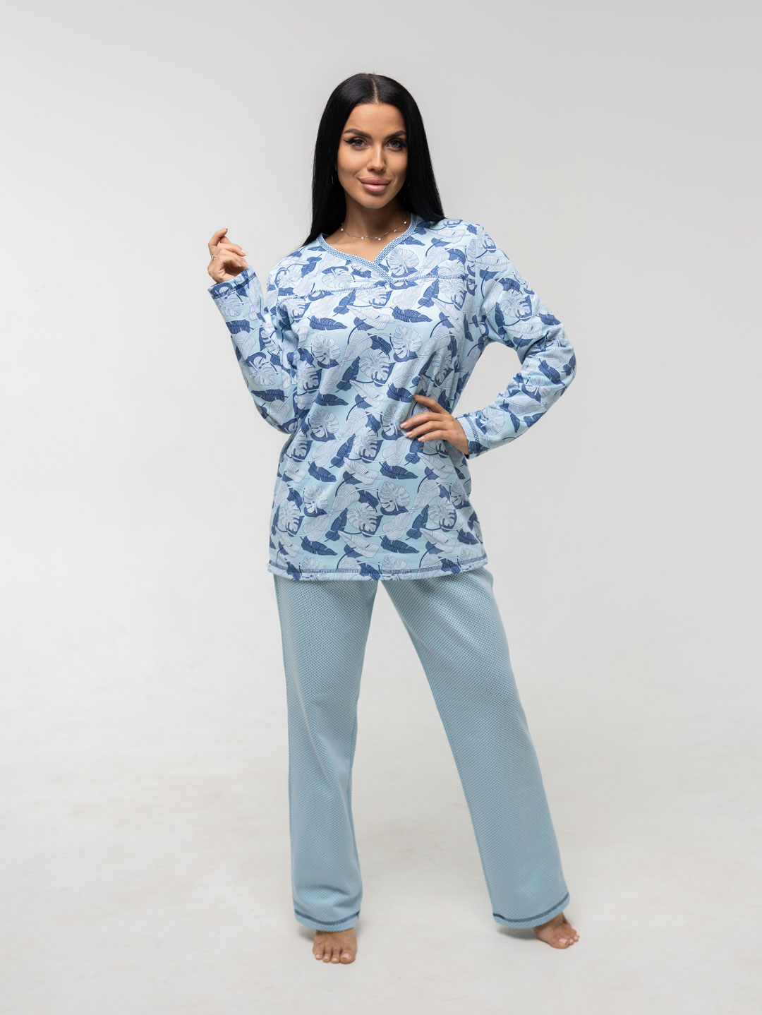 Женская пижама мод.1759/10 / Голубой из приятной трикотажной ткани с мягким начесом. Отличный комплект для сна и отдыха, в нем Вы будете засыпать с комфортом. Пижама выполнена из тканей компаньонов, которые идеально подходят друг другу. Верх свободного силуэта, не сковывает движения, с кокеткой на запах. Брюки свободного силуэта, полноценной длины, без карманов.