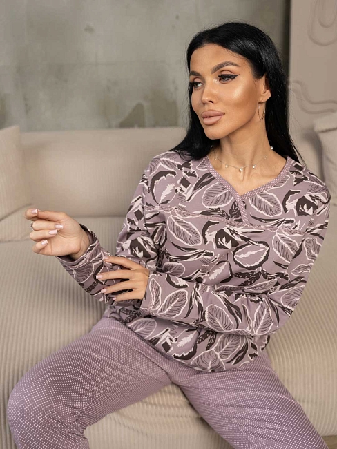 Женская пижама с брюками и лонгом, выполнена из тканей компаньонов, изнанка приятная к телу, с небольшим начесом. Лонг с кокеткой на запах и фактурной отстрочкой по горловине, рукаву и низу. Брюки с мягкой резинкой, комфортной для сна и отдыха.