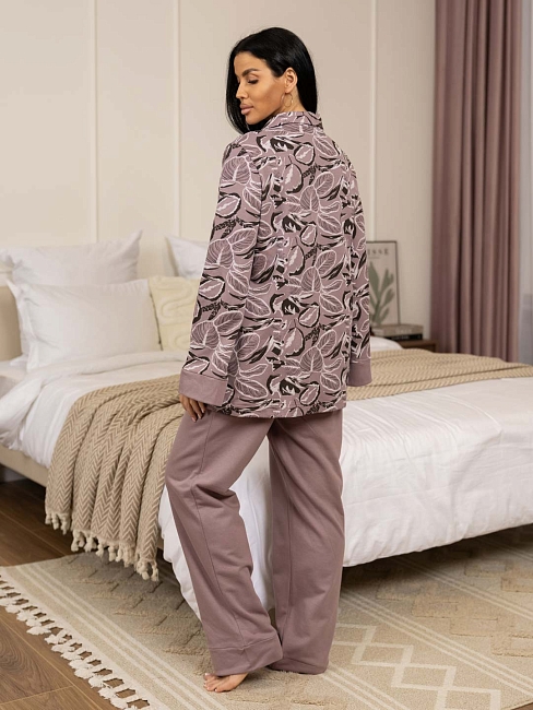 Женская пижама из футера с начесом, верх рубашка с отложным воротником на пуговицах, рукав длинный с манжетой в цвет брюк. Брюки прямые полной длины на резинке без карманов с манжетами по низу, при необходимости можно отогнуть манжеты и сделать брюки длиной 7/8.
