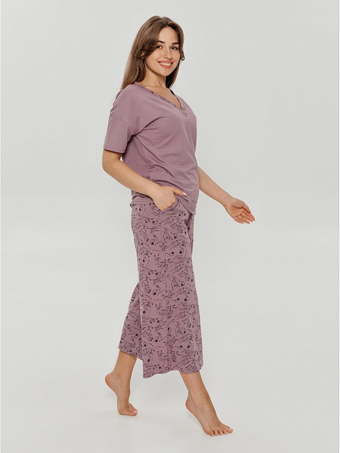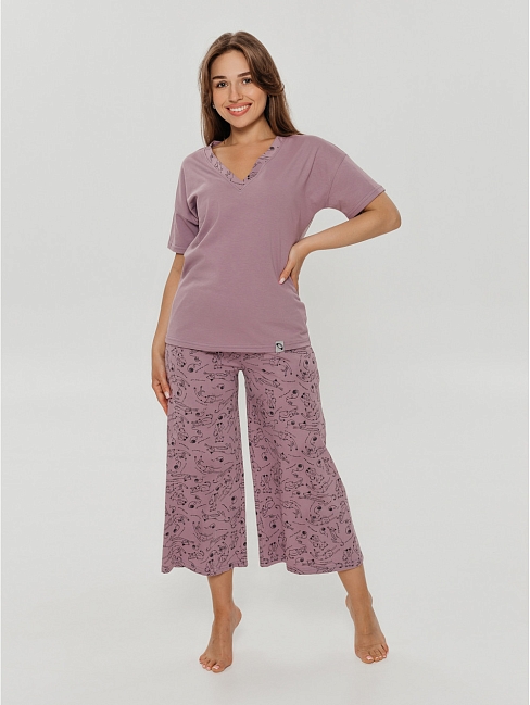 Модная пижама - это комфортная одежда для отдыха, которую по достоинству оценят. Пижама Мурка состоит из широких штанов кюлотов с высокой посадкой и футболки с коротким рукавом. Удобные брюки на резинке на талии не стесняют движения.