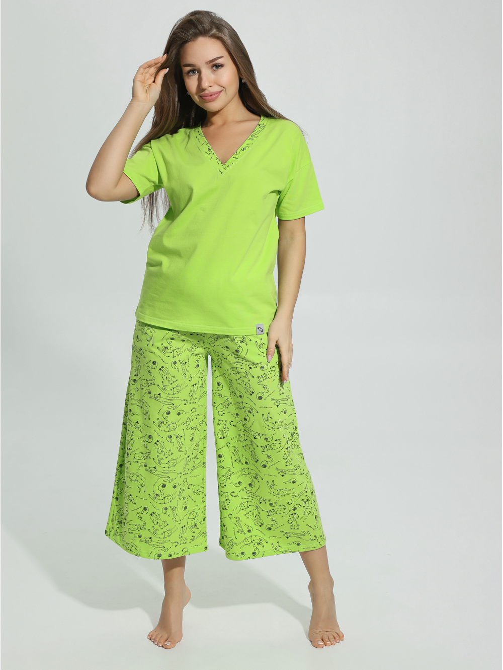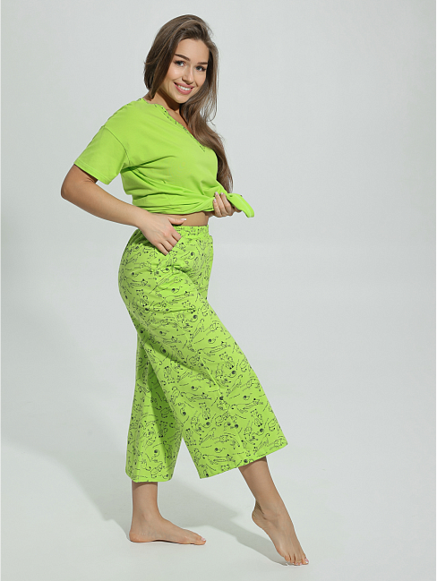 Модная пижама - это комфортная одежда для отдыха, которую по достоинству оценят. Пижама Мурка состоит из широких штанов кюлотов с высокой посадкой и футболки с коротким рукавом. Удобные брюки на резинке на талии не стесняют движения.