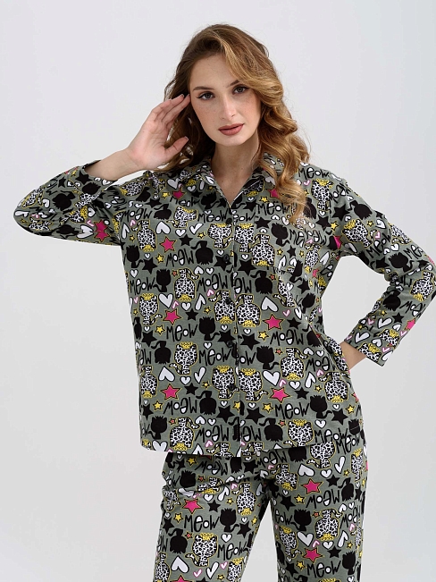 Пижама женская "Мяу" (классическая) 2271-К / Зеленый со штанами выполнена из 100% хлопка - это стильный домашний лук и ночная пижама 2 в 1! Рубашка дополнена отложным воротником и застёжкой на петли и пуговицы. Брюки пижамные, свободного покроя.