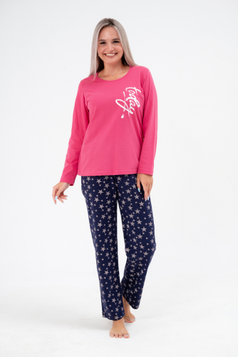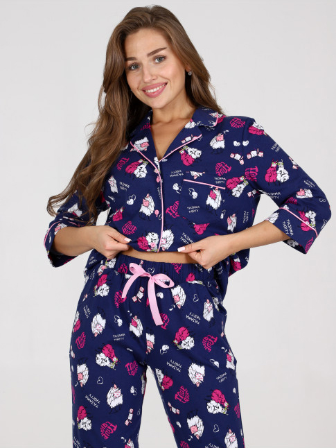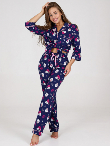Элегантная пижама костюмного типа с брюками. Рубашка с рукавом 3/4, кармашком на груди, английским воротником. Брюки с поясом-резинкой, двумя внутренними карманами и декоративным атласным бантом.