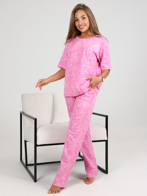 Женская пижама из 100% хлопка, прямые брюки на поясе-резинке с нашивкой и двумя внутренними карманами, свободная удлиненная футболка.