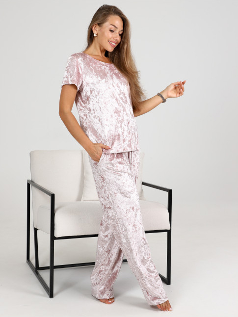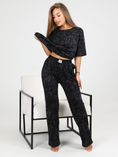 Свободная футболка и прямые брюки на комфортном поясе-резинке с декоративным атласным бантом.