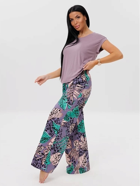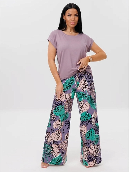 Женская пижама П-172 (К+Вис) / Фиолетовый (листья) состоит из свободной футболки со спущенными рукавами и пижамных брюк.