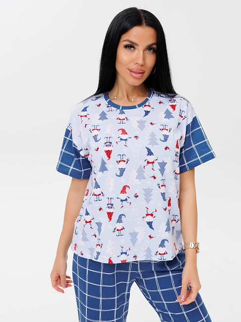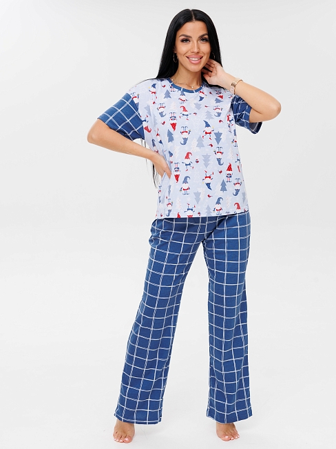 Женская пижама П-85(К) из трикотажного 100% хлопка. Уютная домашняя одежда состоит из футболки с коротким рукавом и пижамных брюк. Штаны на резинке, футболка свободного кроя.