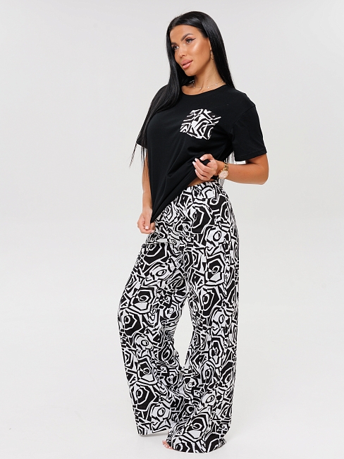из футболки и брюк. Женский костюм с брюками изготовлен из кулирки, хлопковой
