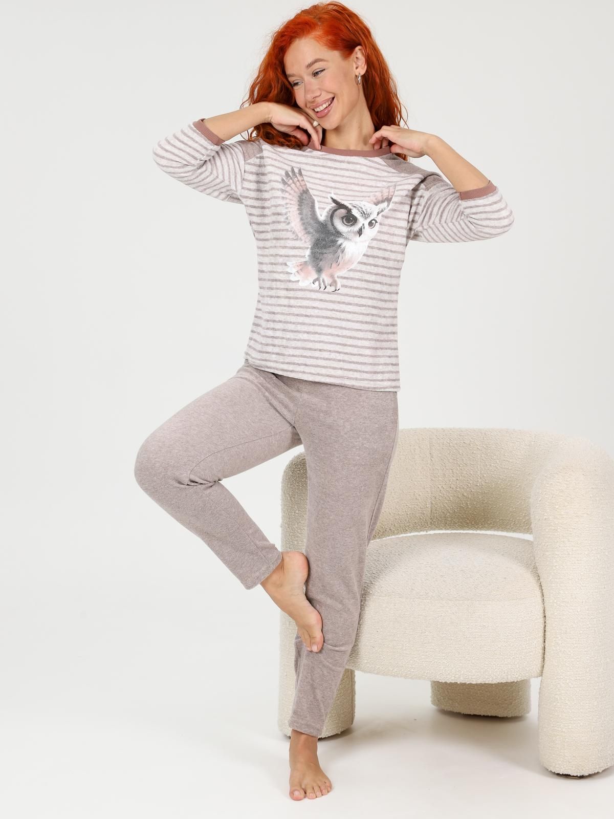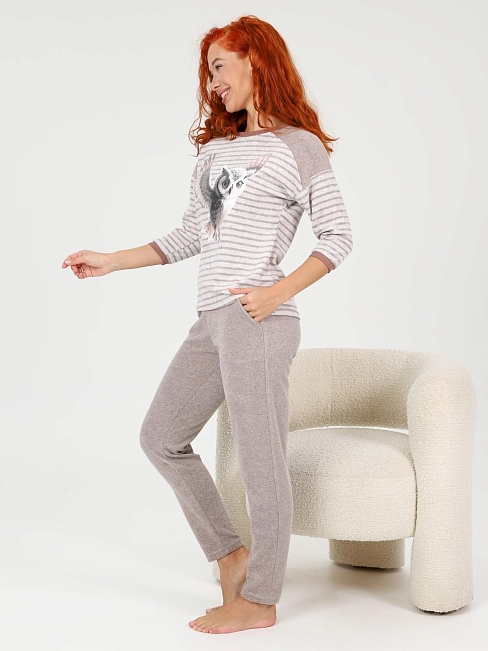 Пижама состоит из кофточки и брюк. Брюки с карманами в боковых швах. Верх на резинке. Кофточка прямого силуэта. Рукав длиной 3/4. Манжет рукава и планка горловины из эластичной рибаны.