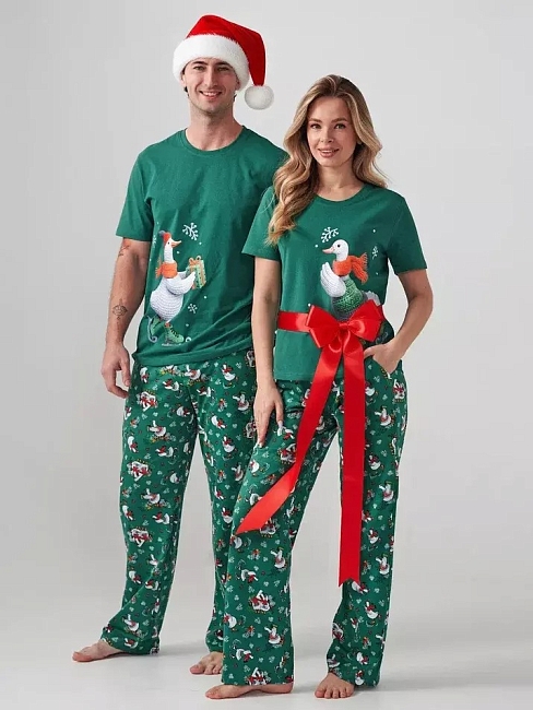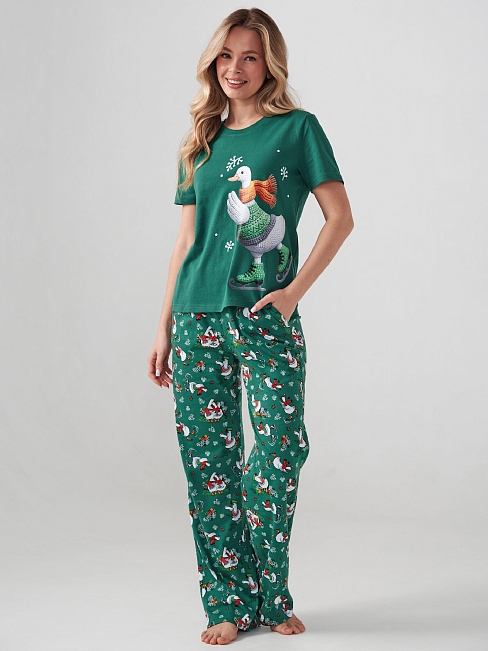Женская пижама "Зимние забавы" 2411-К / Зеленый с футболкой и свободными брюками, отшивается из хлопкового трикотажного полотна. Веселый яркий принт создаст настроение.