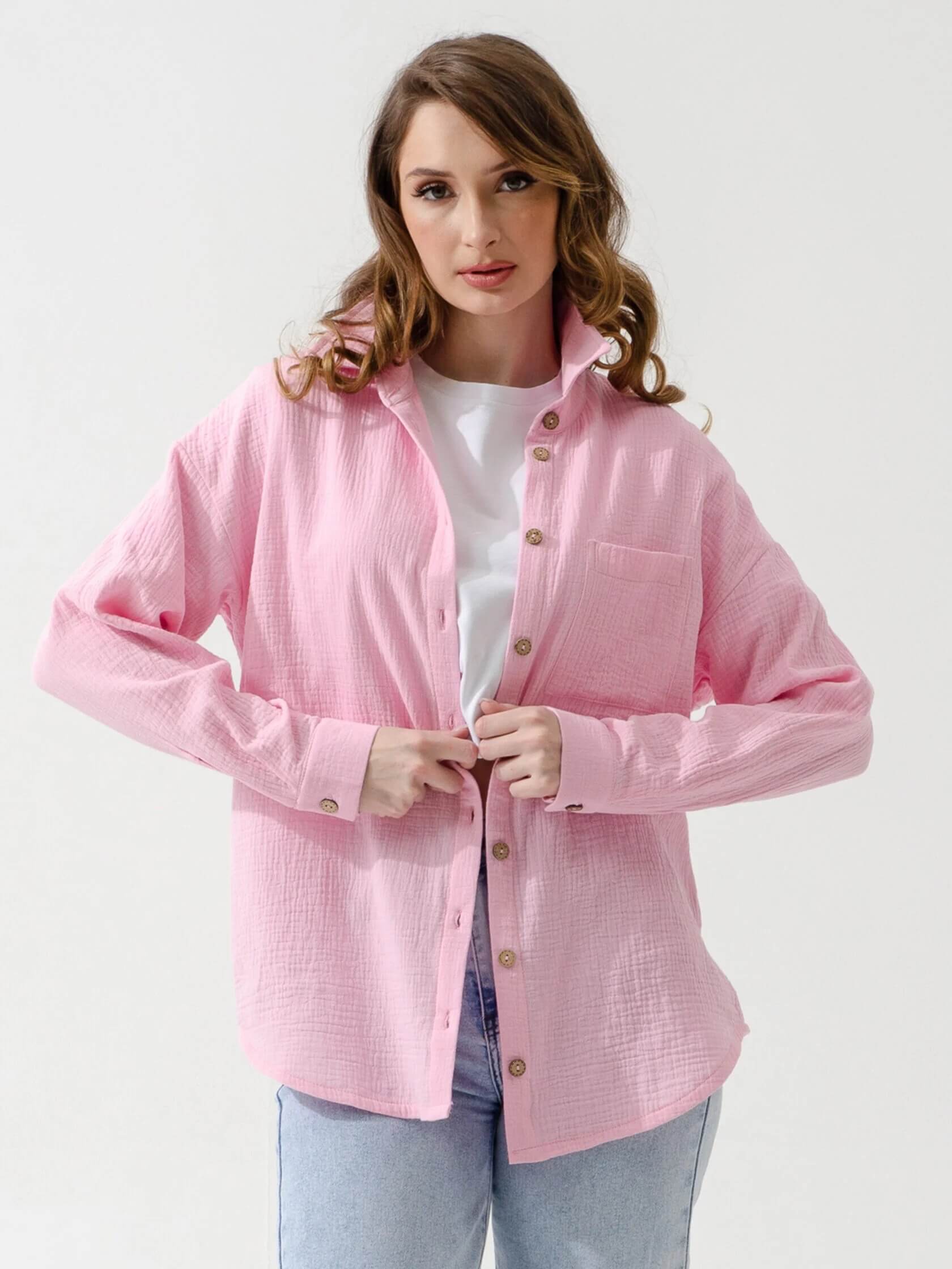 Женская рубашка "Муслин" 2315-Мус / Розовый с длинными рукавами, на пуговицах. Женская рубашка отшивается из натуральной хлопковой ткани муслин.