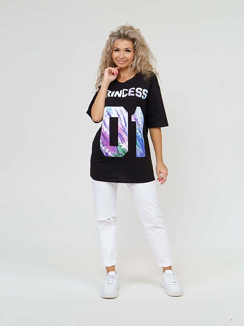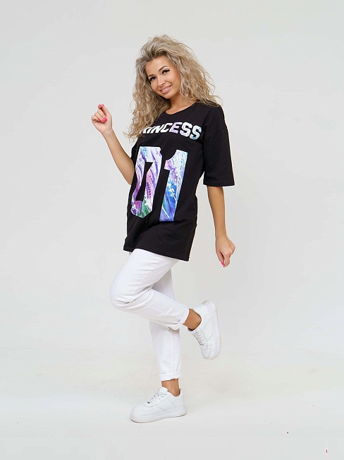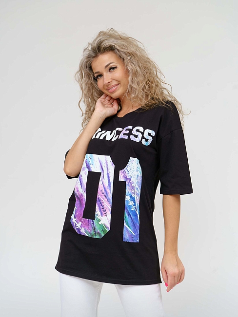 Туника женская мод.1631/1 / Черный из 100 % хлопка с эффектным стильным принтом поможет создать очаровательный образ, подарит чувство легкости и комфорта. Платье туника прямого свободного кроя идеально садится по фигуре, скрывает все недостатки. Наша туника универсальна, она идеально подойдет в качестве домашней одежды и как повседневный лук, дополните тунику кедами и сумкой кросс-боди. Черный цвет материала прекрасно сочетается с любыми аксессуарами.