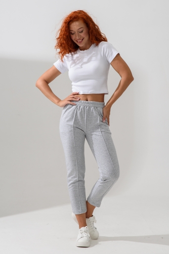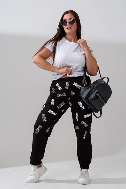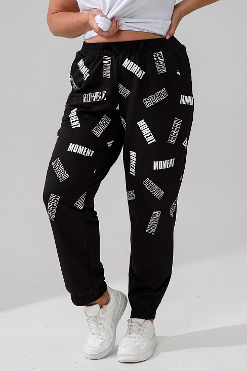 Брюки женские, свободные по бедрам, зауженные к низу. Спереди внутренние карманы, низ  передней части брюк собран на эластичную ленту. Пояс выполнен на многоигольной машине. На передней и задней частях брюк принт. Идеальны для повседневной носки.