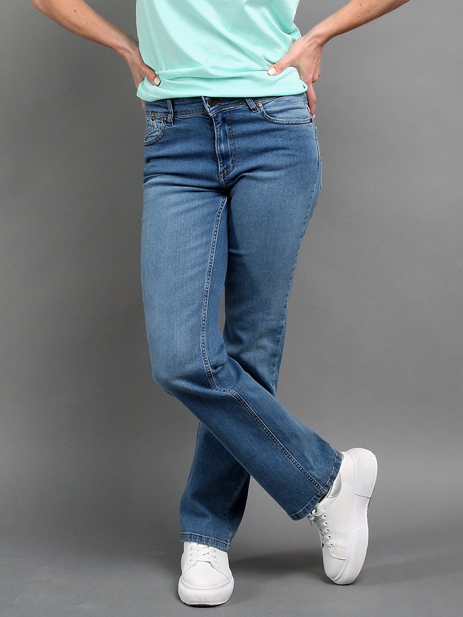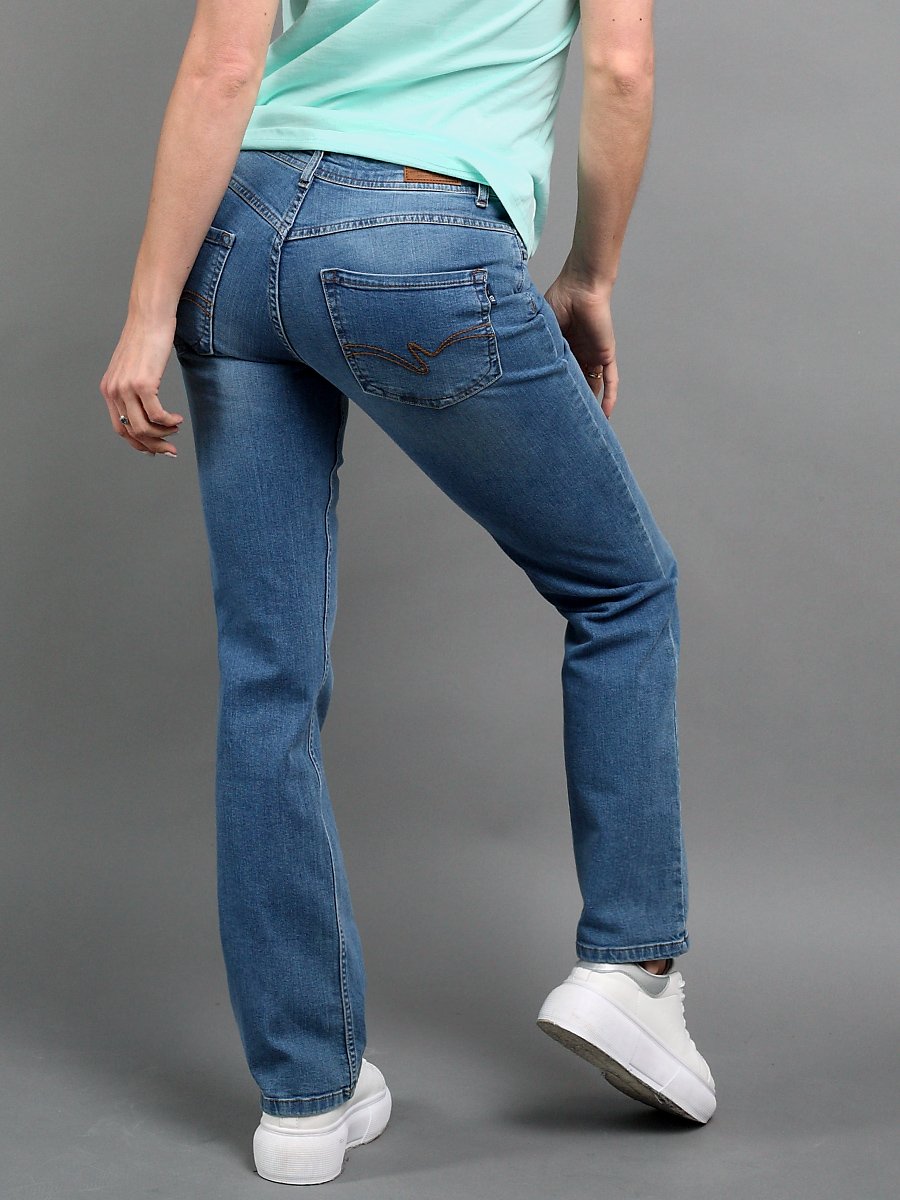 Женские классические джинсы с оригинальным дизайном часового кармана. Посадка Regular fit (полуоблегающие по бедру). Средняя высота талии спереди и высокая сзади.. Застежка на молнии. Прямые к низу от колена. Для улучшения посадки по талии сделан подкройной пояс из 2-х частей. Выполнены из слабоэластичной ткани denim comfort stretch. Средняя стирка с потёртостями спереди и сзади. Параметры указаны для размера 28. Длина внутреннего шва - 80,5см.