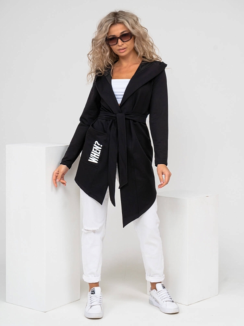 Кардиган женский мод.1276 / Черный с асимметричной линией низа, объемным капюшоном и карманом на правой стороне. Изделие укомплектовано поясом.