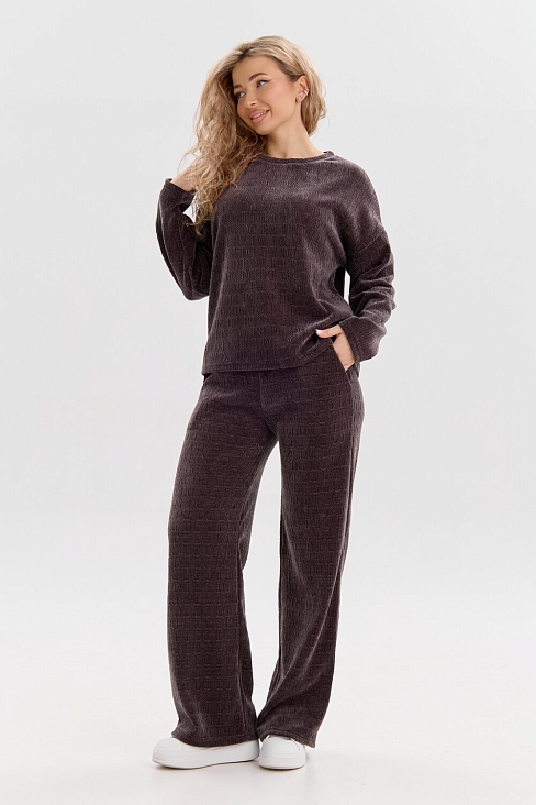 Женский костюм выполнен из жаккарда высокого качества. Жаккард - высокотехнологичный материал, прошедшей особую обработку. Ткань отличается высокими теплозащитными свойствами, при этом является дышащей. По своим характеристикам она не уступает шерстяным полотнам. И даже в сыром состоянии удерживает тепло у тела.  Материал прочный, эластичный, влагостойкий. Воздухопроницаемая гигроскопичная ткань создает для тела комфортный микроклимат. Изделия из жаккарда легкие, не мнутся, не деформируются, не вытягиваються.В такой одежде удобно и комфортно. Эластичность материала позволяет легко двигаться. Костюм состоит из лонгслива и брюк. Лонг в стиле OVERSIZE ( одежда свободного кроя ) - это свобода самовыражения, позволяющая чувствовать себя комфортно и стильно одновременно. Горловина свитшота выполнена с обтачкой. Линия плеча спущена, длинный рукав. Женские стильные брюки - трубы представлены с вместительными боковыми карманами. Пояс выполнен на специализированной круговой поясной машине, что делает швы ровными и качественными. А профессиональные закрепки на поясе, придают изделию законченный вид и качество. Свободный крой прекрасно будет смотреться на дамах с любыми формами. Костюм такого плана представлен в широкой размерной сетке, что позволяет выбрать его как девушке, так и женщине. Костюм модных расцветок, будет удачным выбором для поездок в отпуск, на пикник, для школы, для активного отдыха и прогулок по городу. Будет гармонично сочетаться как с кроссовками, так и с ботинками. Используя эту модель в качестве домашнего костюма, Вы поймёте, что это именно тот самый идеальный вариант, в котором  будете себя чувствовать удобно, комфортно и современно. Костюм с брюками - это настоящая находка для тех, кто ценит свою индивидуальность!