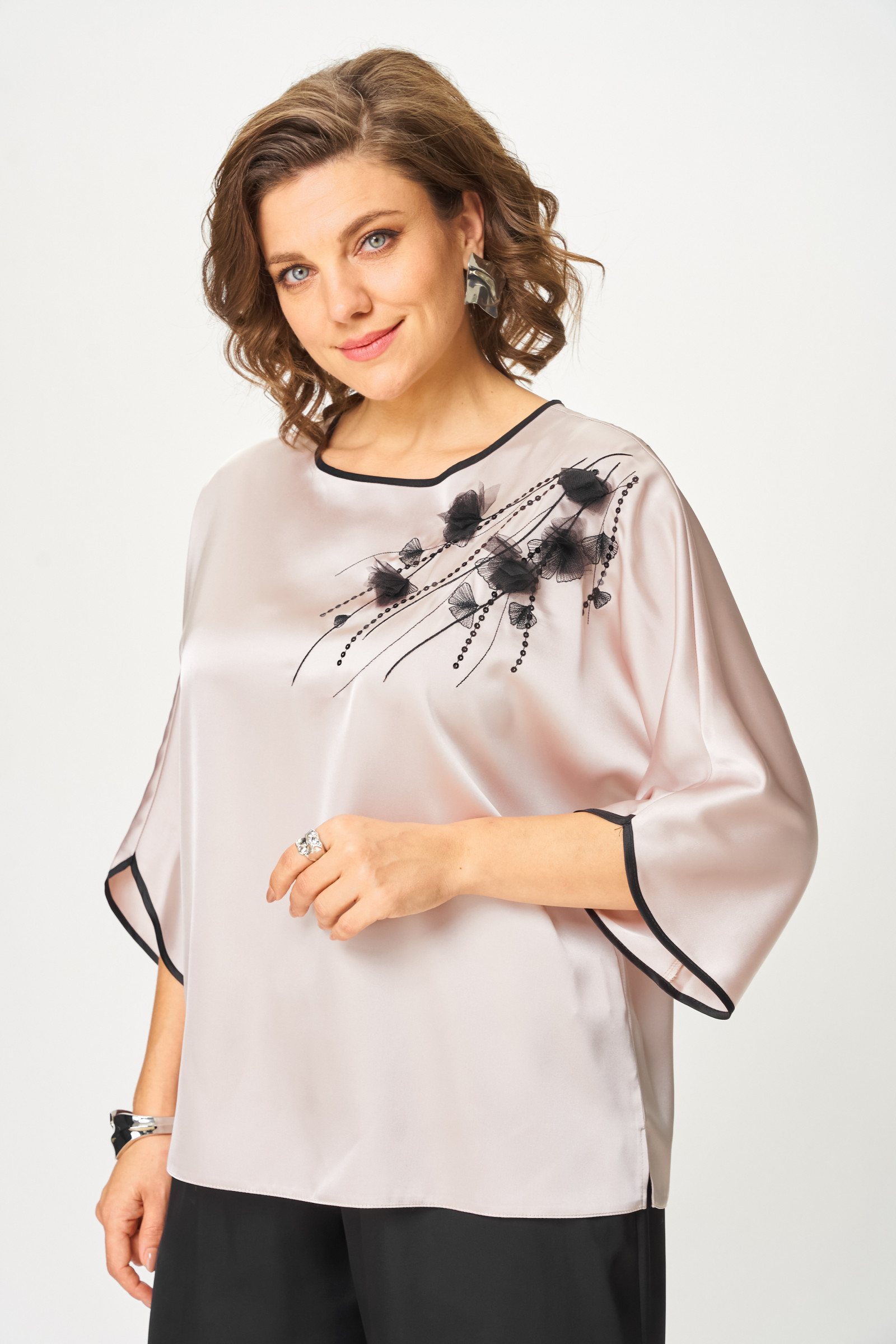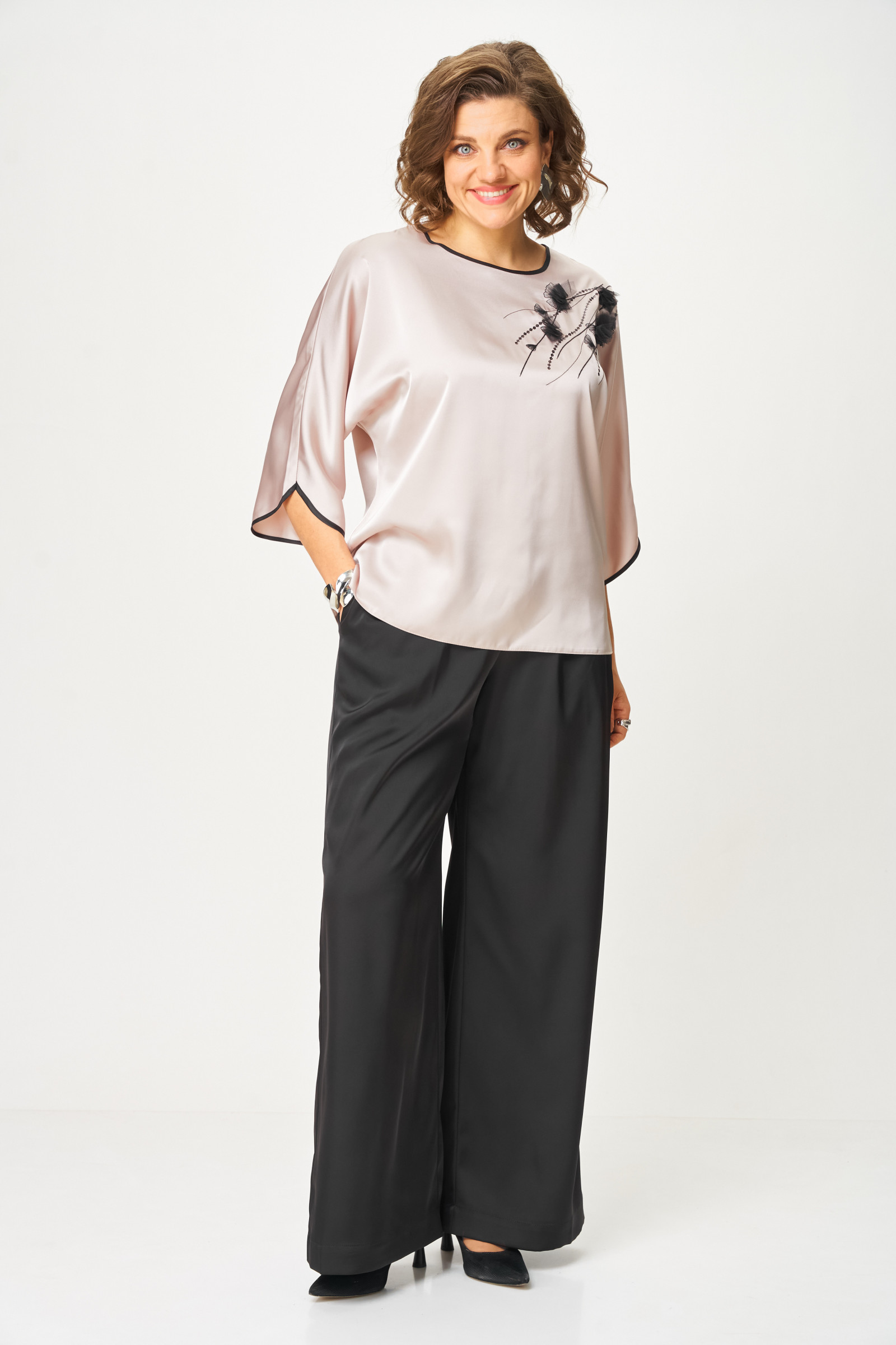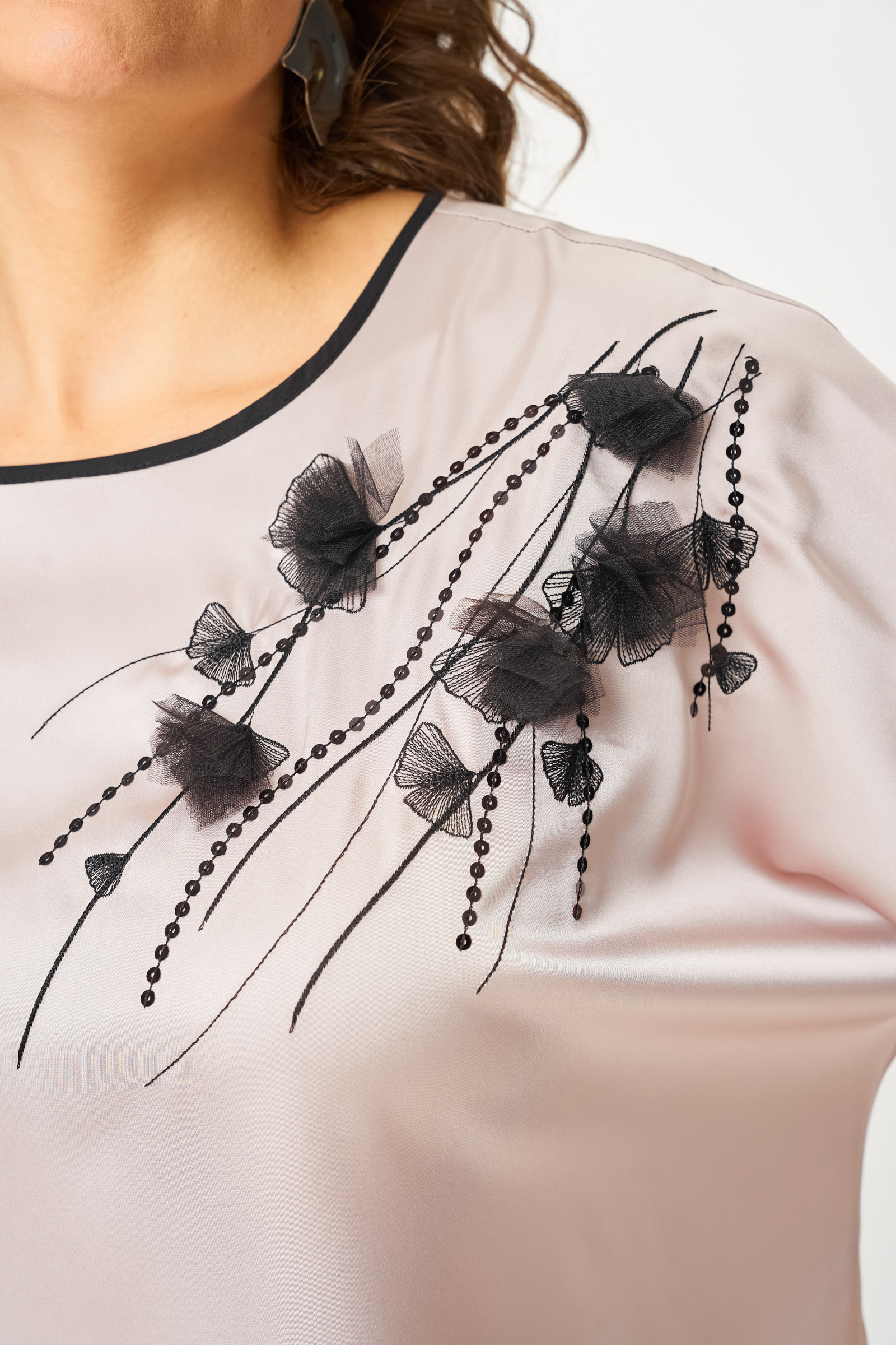 Это женский костюм из струящейся атласной ткани, предназначенный для торжественной носки, сочетающий стиль и комфорт. В состав костюма входят блузка красивого жемчужного оттенка и черные прямые брюки. Блузка выполнена в классическом прямом силуэте и украшена дизайнерской вышивкой в виде цветов с веточкой на передней части, что придает ей изысканный вид. Спинка блузки имеет средний шов с застежкой-капелькой на одну петлю и пуговицу. Горловина расширенная аккуратно обработана притачной тесьмой, а цельнокроеные рукава с низом также отделаны тесьмой, что создает завершенный и аккуратный дизайн. В боковых швах расположены небольшие разрезы для удобства при движении. Брюки имеют классический прямой крой, верхний срез обработан притачным поясом со вставкой на резинке для комфортной посадки. В боковых швах встроены потайные карманы, что делает их практичными и удобными. Этот элегантный и практичный костюм отлично подойдет дляторжественных образов, сочетая стильный дизайн с комфортом в носке.