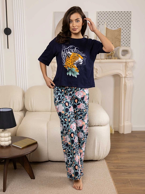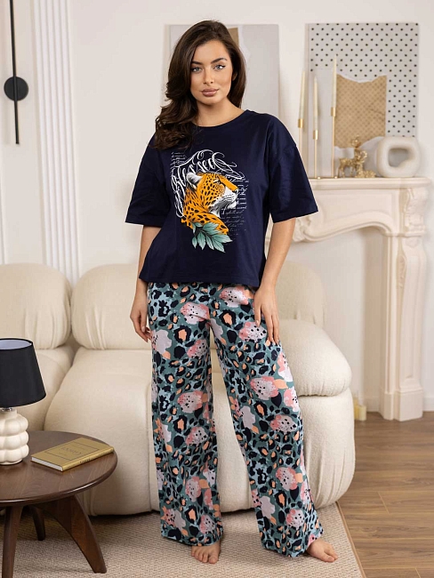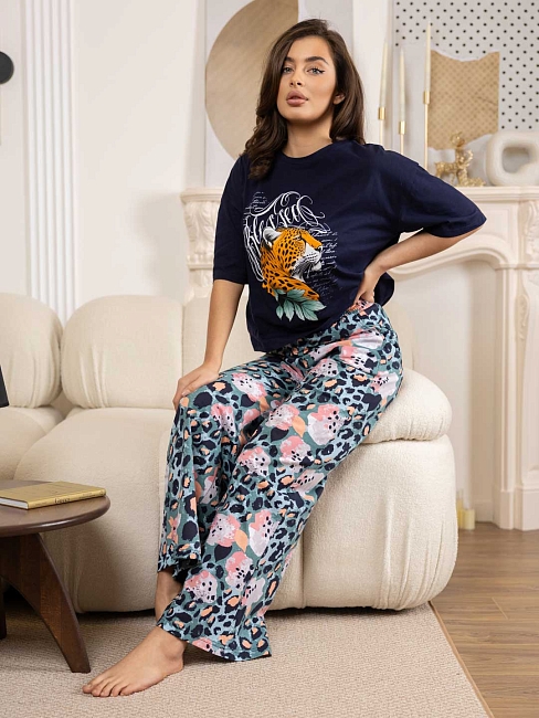 Домашний костюм из хлопка идеально подойдет для дома. Комплект состоит из брюк и футболки. Широкие брюки с карманами на эластичном поясе. Футболка со спущенной линией плеча и свободным силуэтом обеспечит комфорт во время отдыха, спереди и сзади нанесен принт. Рост модели 165см.