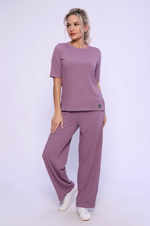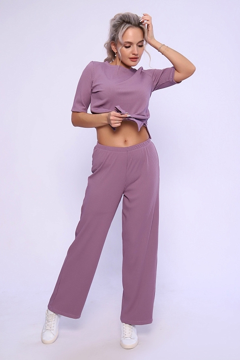 Женский костюм из лапши — это комплект одежды, изготовленный из трикотажного материала с рельефной текстурой, напоминающей макароны-лапшу. Такой костюм сочетает комфорт, эластичность и стильный внешний вид, подходит для повседневной носки, дома, прогулок или спорта.