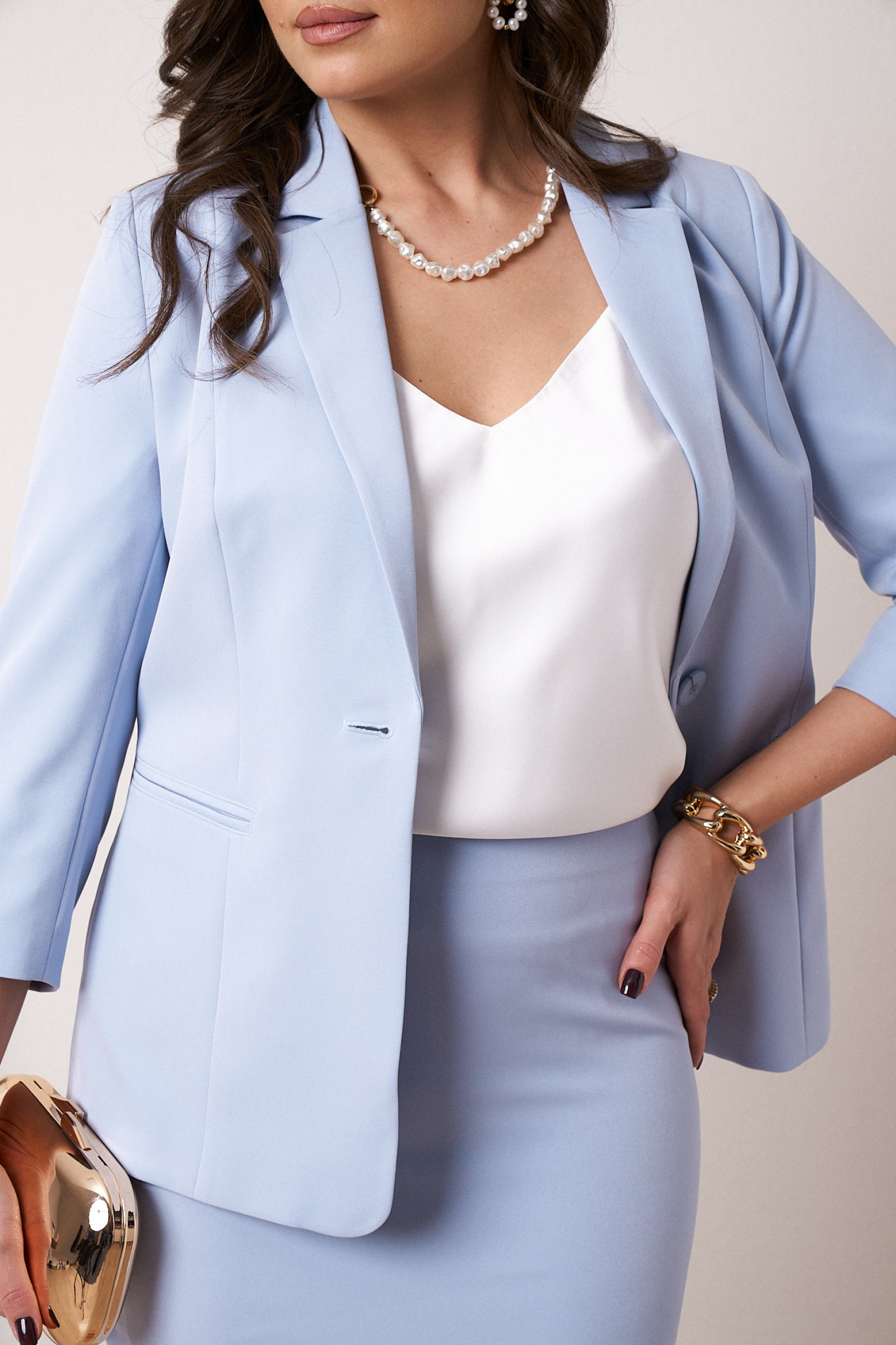Женский костюм для повседневной носки. В костюм входят жакет и юбка. Жакет прилегающий однобортный, застёжка на одну петлю-пуговицу. Рукав длинный, двухшовный. По переду и спинке имеются рельефы. На передней части изделия прорезные карманы. Юбка полуприлегающего силуэта, длиной до колена. Юбка застегивается на потайную молнию в среднем шве заднего полотнища. Средний шов заднего полотнища заканчивается шлицей.