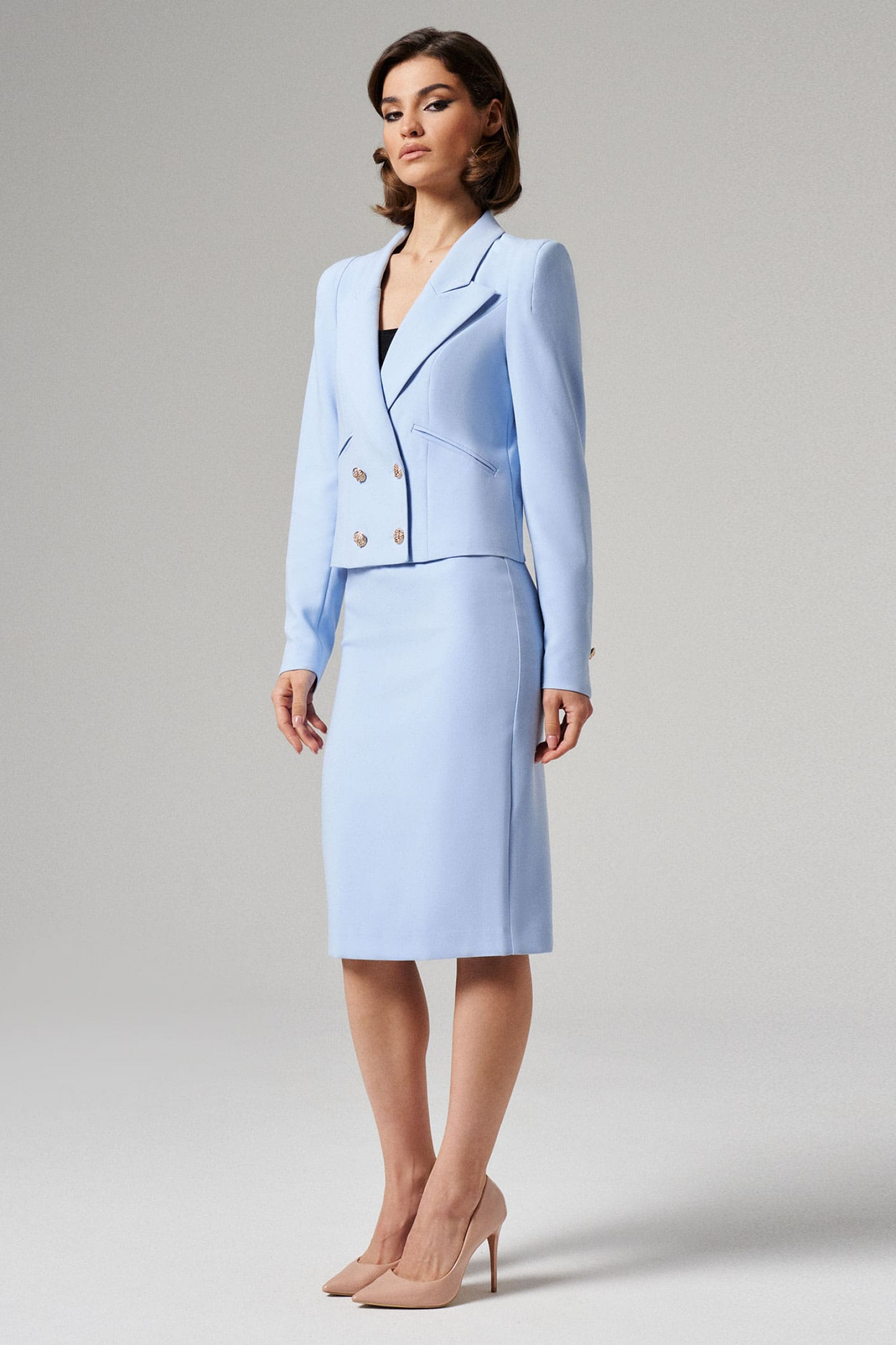 Стильный женский костюм с жакетом и юбкой решит вопрос с созданием образов в официальном стиле. Трикотажный костюм женский хорошо подойдет для прохладного лета и межсезонья. Укороченный жакет с двубортным воротником украшен четырьмя пуговицами, по две в ряд. Дополняет его прямая юбка длиной до колена. Костюм пиджак и юбка женские можно носить самостоятельно или сочетать с майками, футболками, блузками. Для завершения строгих образом подойдут туфли-лодочки на каблуке. Закажите классический юбочный костюм по выгодной цене уже сегодня.