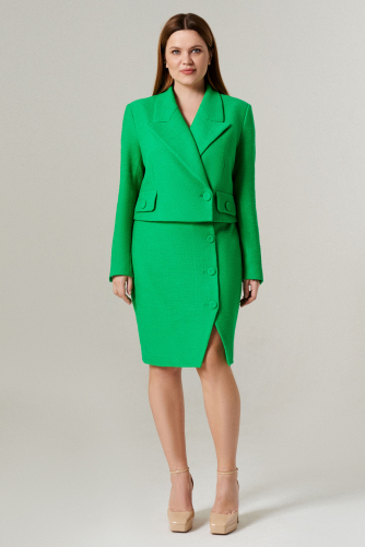 Стильный женский комплект из удобного трикотажного полотна, состоящей из жакета и юбки. Жакет пролуприлегающего силуэта, с застежкой слегка смещеной в бок на петли пуговицы, с рельефными швами, с боковыми карманами. Спинка с рельефными швами и средним швом. Рукава втачные .Воротник асимметричный. Юбка лаконичная поясе с резинкой, на заднем полотнище средний шов. Этот стильный комплект вы можете одеть в самых разных ситуациях и будите выглядеть безупречно.