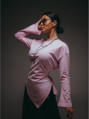 спинке, с длинным расклешенным к низу рукавом, низ ассиметричной геометрической