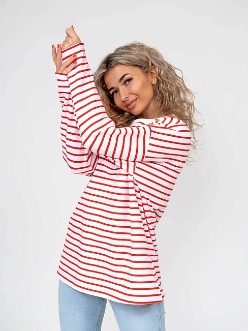 Базовая тельняшка мод.1688/2* / Красный идеально подойдет для составления множества модных аутфитов. Тельняшка в современном прочтении-это обязательно "оверсайз", качественный и невероятно комфортный трикотаж, удлиненные рукава и безупречная посадка! Модель выполнена из европейского трикотажного полотна, качества пенье.