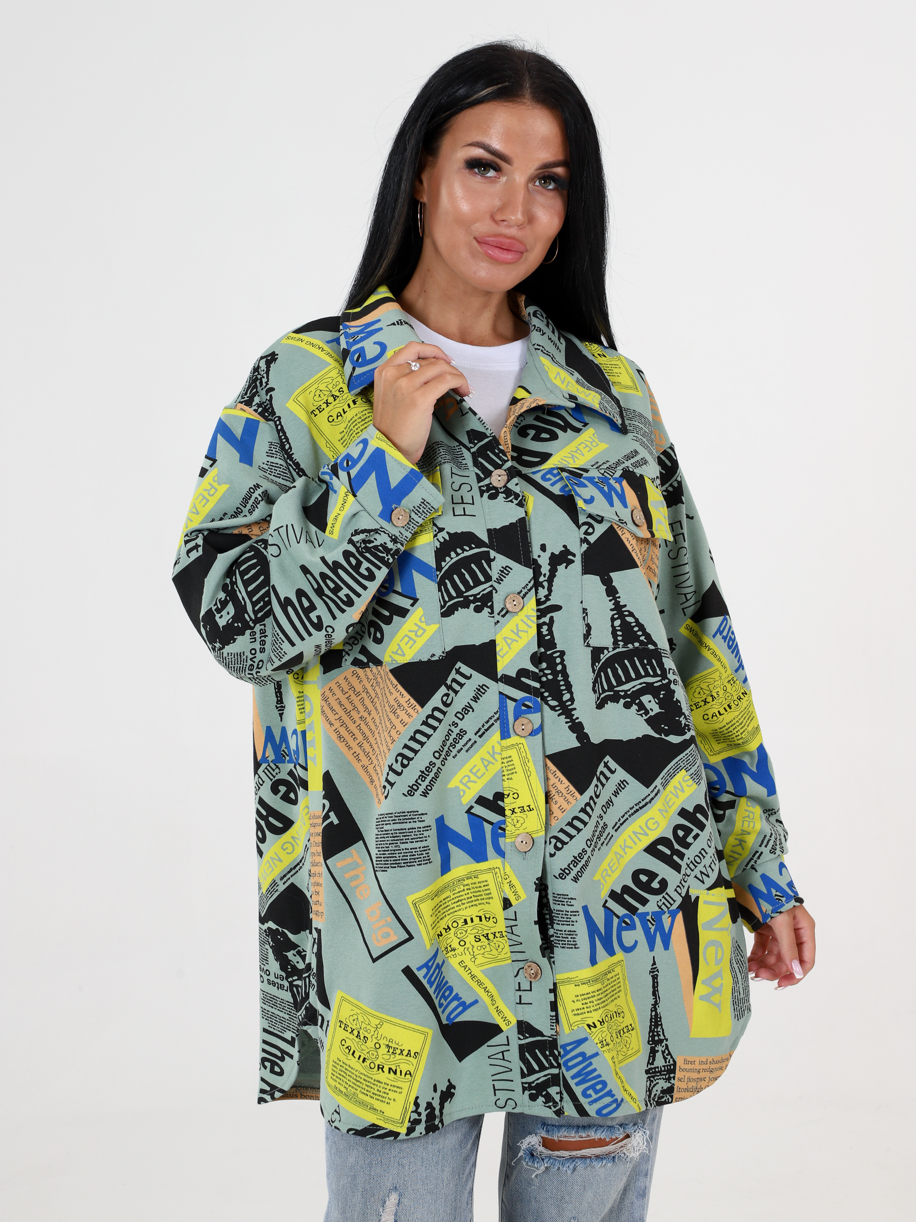 Жакет слегка объёмный, удлинённого силуэта, с отложным воротником. Длинные рукава с заниженной линией плеча, планка и рукава с манжетами на пуговицах, нагрудные карманы с клапанами. Женский жакет на пуговицах можно сочетать с базовым топом или блузой, фактура и плотность ткани позволяет носить жакет как рубашку. Будет актуально смотреться в любое время года. Женский жакет / рубашка сшит из плотного трикотажного полотна - футер. Благодаря свободному oversize крою модель сидит хорошо на любом типе фигуры. Удлиненная рубашка / жакет достойная альтернатива легкой куртке, ветровке, джинсовке.