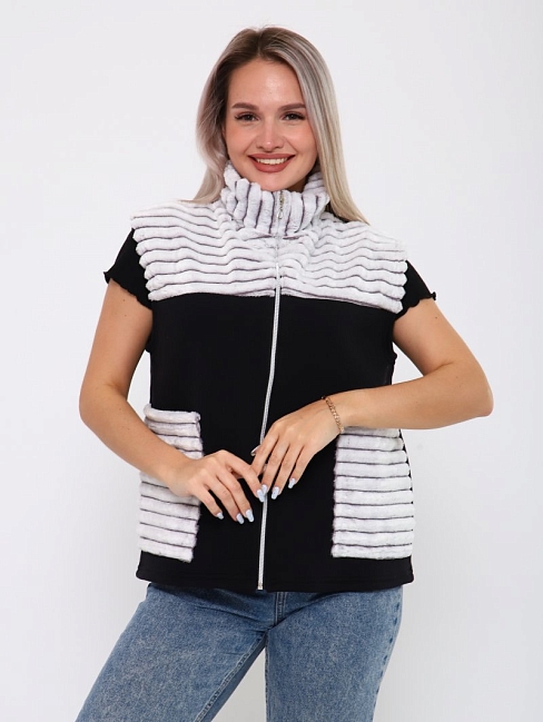 Женские жилетки из комбинированных тканей велсофта и футера — это мягкие, тёплые и практичные изделия, которые подходят для повседневной носки, дома или прогулок. Велсофт — трикотажный материал из полиэстера, обладающий высокой теплоизоляцией, воздухопроницаемостью и износостойкостью.