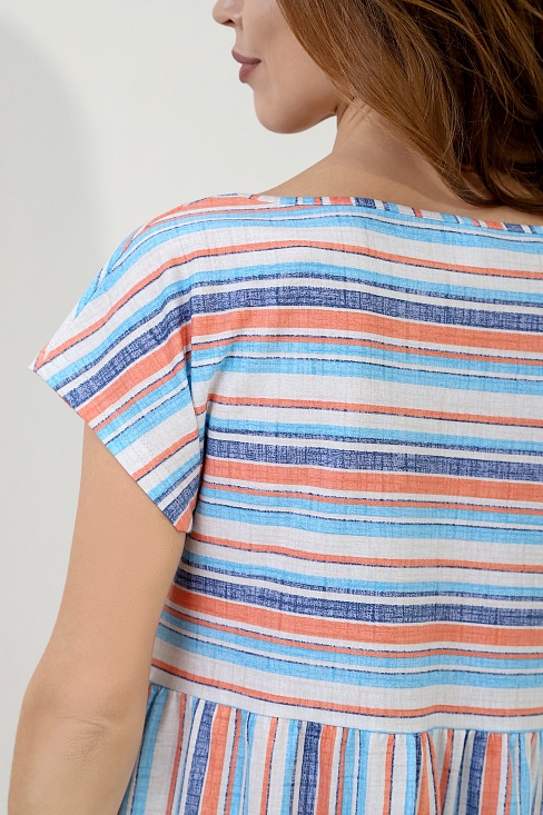 Платье молодежное из полотна «кулирка» в полоску, отрезное по линии талии, с широкой юбкой на сборке, короткими цельнокроеными рукавами, горловиной овальной формы, окантованной основным материалом, с карманами в боковых швах.